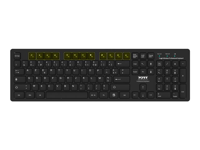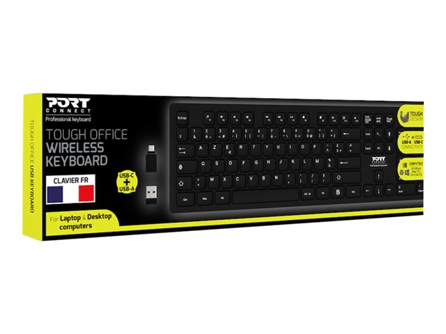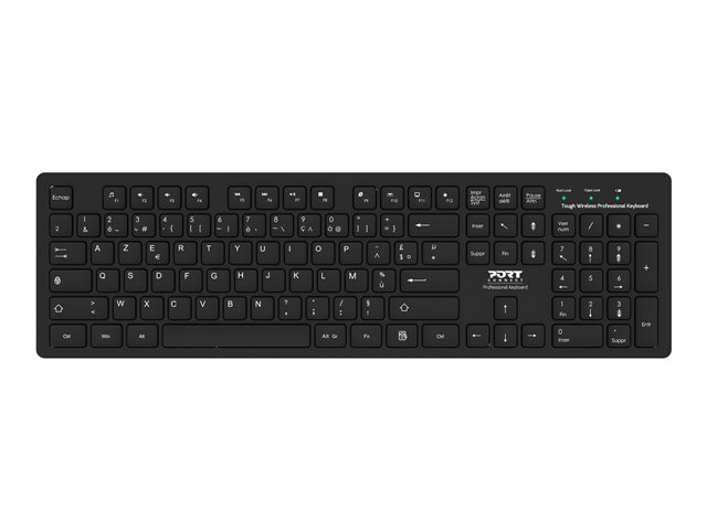 Le clavier de bureau robuste et sans fil de PORT Connect (configuration AZERTY) est parfait pour les professionnels à la recherche de matériel robuste et durable. Utilisant la technologie sans fil 2,4 GHz, profitez d'une liberté de mouvement jusqu'à 20 mètres. Bénéficiez d'une expérience fluide et réactive avec 12 raccourcis multimédia et des indicateurs LED pour le verrouillage des chiffres, le verrouillage des majuscules et le niveau de la batterie. Sa conception durable et antidérapante aux lignes lisses et arrondies convient parfaitement aux environnements de travail. Compatible avec Windows, Mac OS et Chrome OS via USB-A ou USB-C. Aucun pilote n'est nécessaire grâce à son installation Plug & Play.