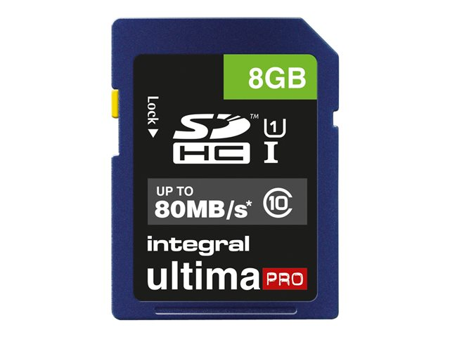 Description du produit Integral UltimaPro - carte mémoire flash - 8 Go - SDHC UHS-I Type du Produit Carte mémoire flash Format Carte mémoire SDHC UHS-I Capacité de stockage 8 Go Indice de vitesse UHS Class 1 / Class10 Garantie du fabricant Garantie de 5 ans -
