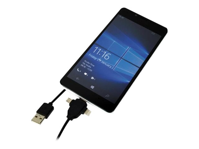 Ce câble multi-usages vous permettra de charger ou d'effectuer des transfert de données de votre smartphone ou tablette qu'ils soient équipés de prise Micro-USB, USB Type-C ou Lightning.