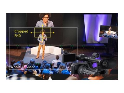 Le recadrage du champ permet à une image cadrée par une seule caméra d'être visualisée simultanément comme deux images de sortie différentes. L'utilisateur peut découper une plus petite image en Full HD de l'image grand angle principale en 4K, par exemple pour afficher le visage de l'intervenant en gros plan. De plus, la zone recadrée peut être définie comme étant statique ou dynamique pour suivre les mouvements de l'intervenant.