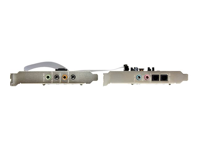 Cette carte son PCI-E 7.1 voies constituera un ajout sonore de qualité à votre home cinéma. Vous vivrez une expérience unique grâce à l'audio optique numérique cristalline de ses ports d'entrée et de sortie SPDIF. Fonctionnement polyvalent Cette carte son polyvalente sert avec un grand nombre d'appareils audio. Et avec sa sortie optique numérique SPDIF ou analogique de 3,5 mm, inutile de vous soucier du type de connexions prises en charge par vos appareils. Envoyez l'audio numérique vers votre récepteur optique ou votre DAC, ou encore l'audio analogique vers votre chaîne audio. Cette carte adaptateur son surround 7.1 aux fonctions de lecture et d'enregistrement jusqu'à 24 bits et 192 kHz produit un son haute définition d'une formidable qualité sonore. Installation simple Contrairement aux cartes son ordinaires, cette carte est conçue pour les ordinateurs compacts et donc, parfaite pour les systèmes HTPC (home cinéma sur PC). Elle répartit les multiples ports sur une carte principale plus un support en-tête novateur distinct. Cette carte comporte des supports standard et faible encombrement (demi-hauteur). Rien de plus facile que d'installer la carte son surround 7.1 voies ! C'est le choix qui s'impose pour quiconque recherche une solution simple pour améliorer le son, comme les amateurs de musique ou les professionnels du mixage. Plusieurs options de sortie Misez sur l'évolutivité en branchant rapidement un microphone ou d'autres dispositifs d'enregistrement dans les deux prises d'entrée stéréo 3,5 mm ou audio numérique SPDIF de votre ordinateur. Le modèle PEXSOUND7CH bénéficie de la garantie StarTech.com de 2 ans et de l'assistance technique à vie gratuite.