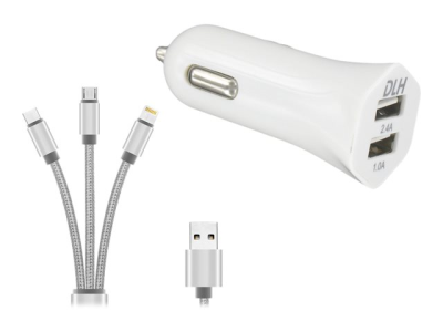 DLH - Adaptateur d'alimentation pour voiture - 12 Watt - 2.4 A - 2 connecteurs de sortie (USB) - blanc