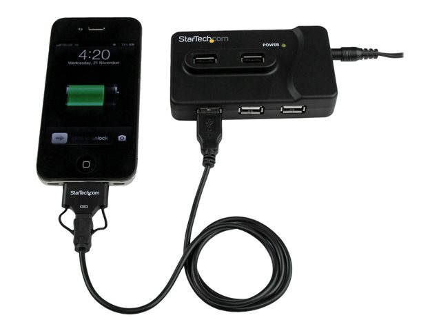 Ce hub comprend un adaptateur d'alimentation externe qui, une fois connecté, permet de charger certains appareils électroniques portables (p. ex., un iPhone ou un autre smartphone), même sans connexion USB à un ordinateur hôte.