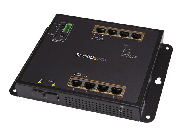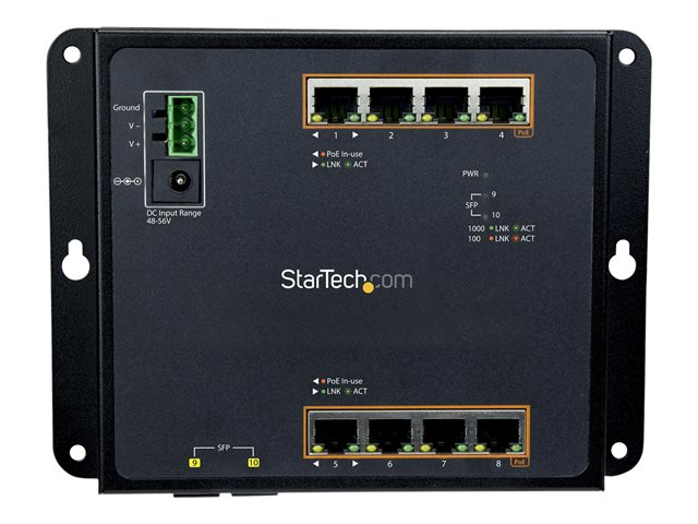 StarTech.com Switch Gigabit Ethernet géré à 8 ports PoE+ avec 2 connexions SFP - Fixation murale et accès en façade (IES101GP2SFW) - Commutateur - Géré - 8 x 10/100/1000 (PoE+) + 2 x SFP - Montage sur rail DIN, fixation murale - PoE+ (200 W) - pour P/N: GLCLHSMDSTTA, GLCSXMMDST, GLCSXMMDSTT, GLCTEST, MASFP1GBTXST, SFP1GELXST